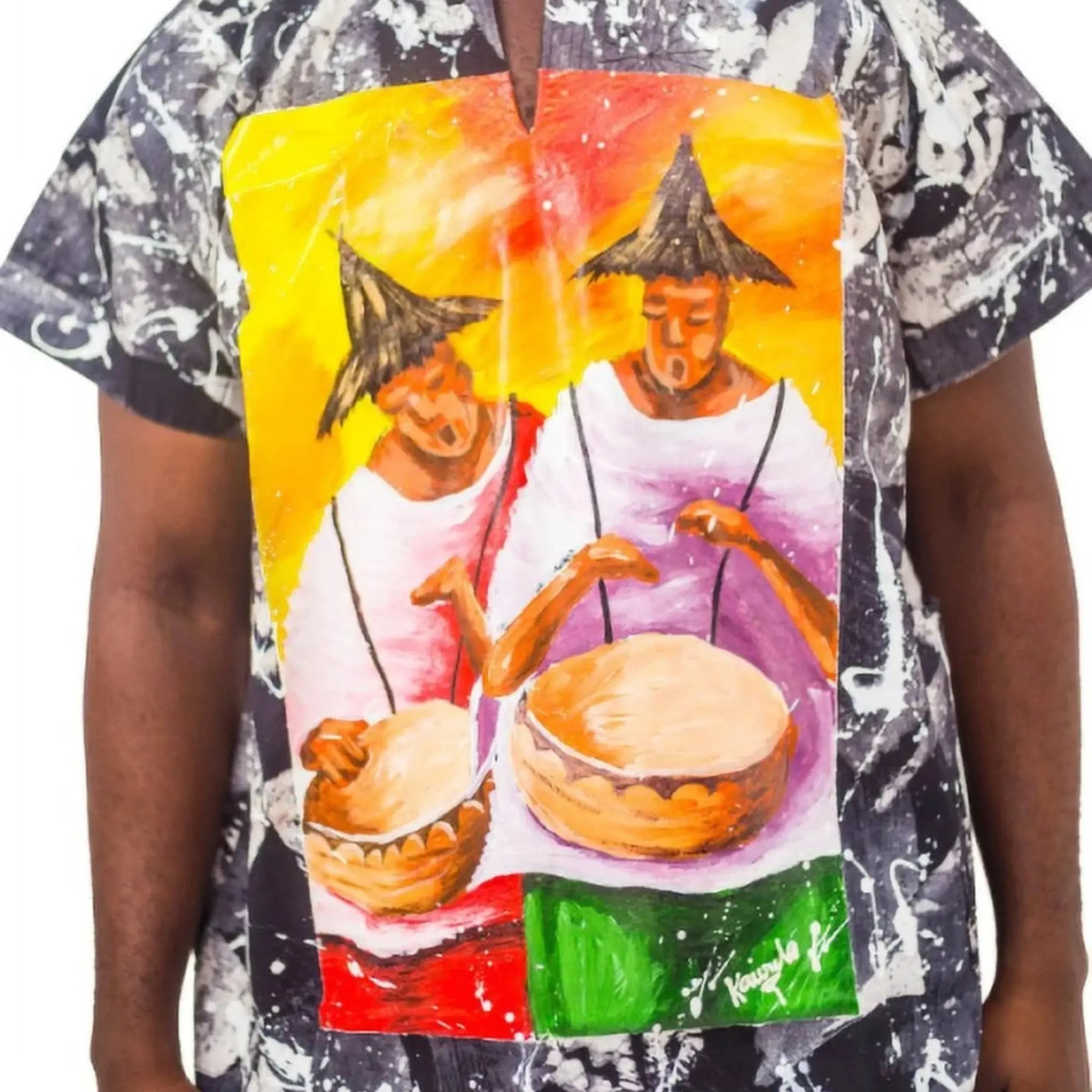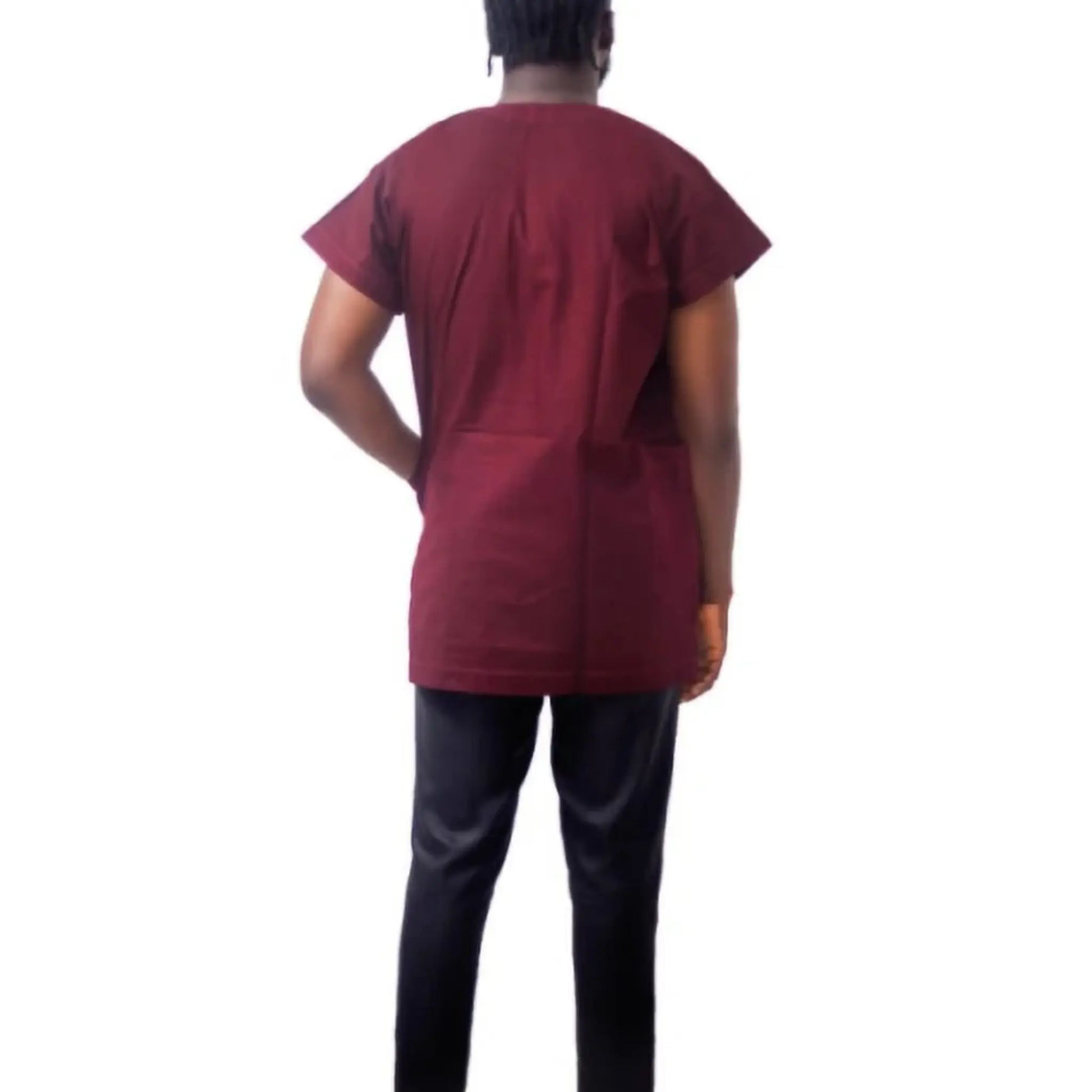 Handcrafted in Africa, this men's top is a true representation of authentic African fashion. Fashioned from soft cotton, it features an attention-grabbing black splash on a white canvas. Its v-neck cut, combined with short sleeves and a well-proportioned shirt length, strikes a perfect balance between comfort and style. Characterized by a rich Burgundy color, this top is a standout addition to any wardrobe.